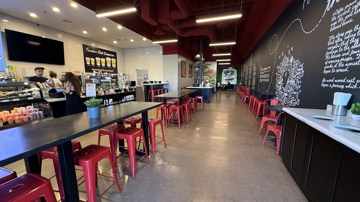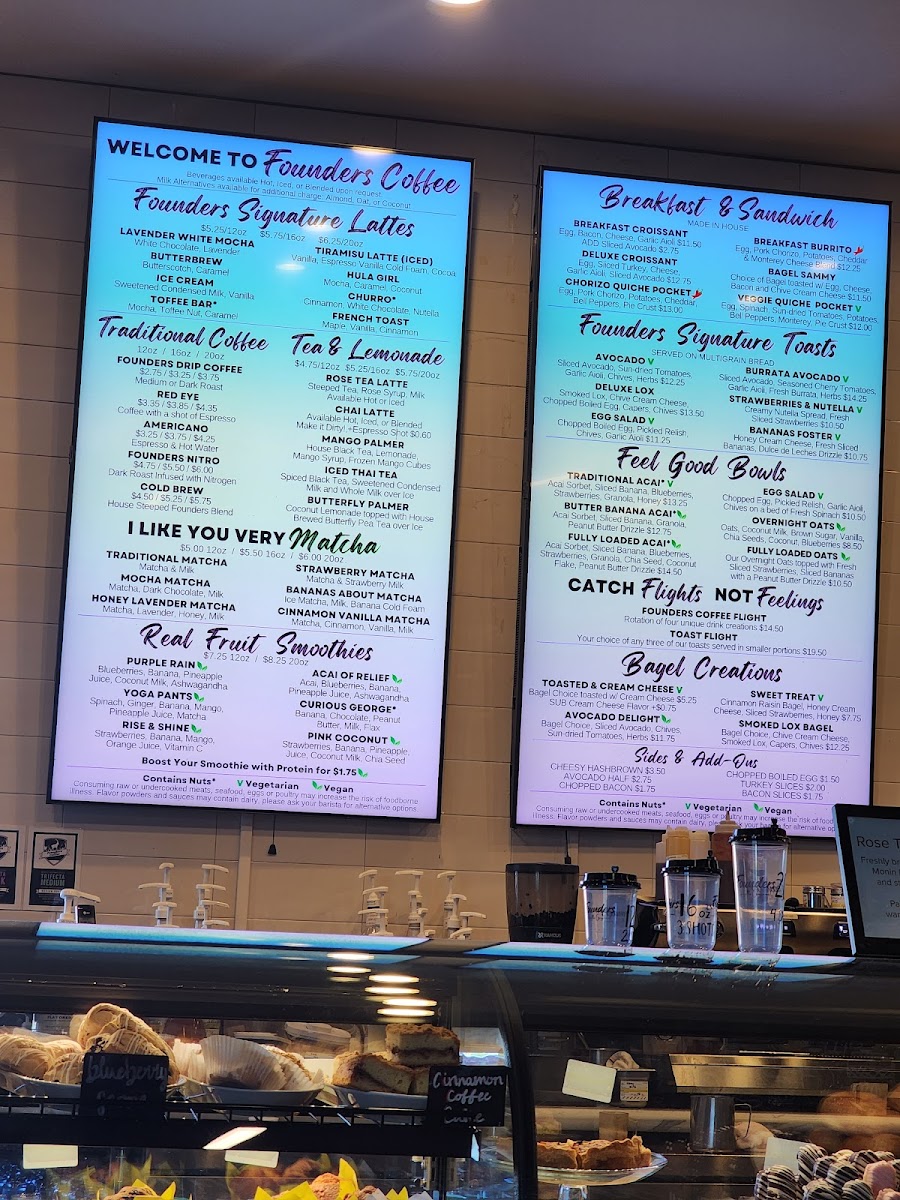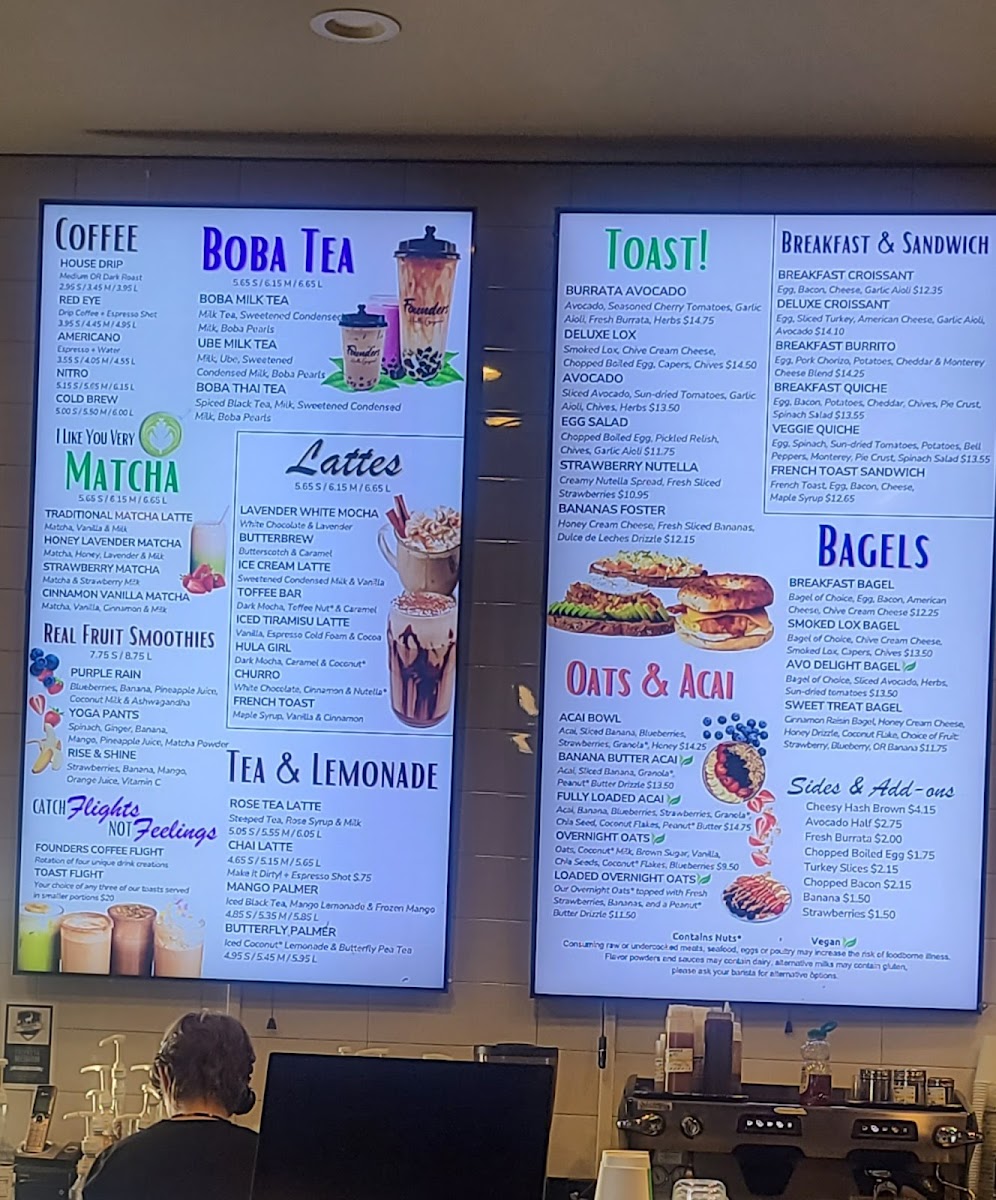 The moment you step inside Founders Coffee, you’re greeted by a rich aesthetic featuring dark colors, plush couches, and industrial-inspired seating— creating an inviting, cozy environment perfect for unwinding or working. Whether you're enjoying a quiet morning alone with a book or catching up with friends over brunch, the ambiance here is designed to make you feel at home.
